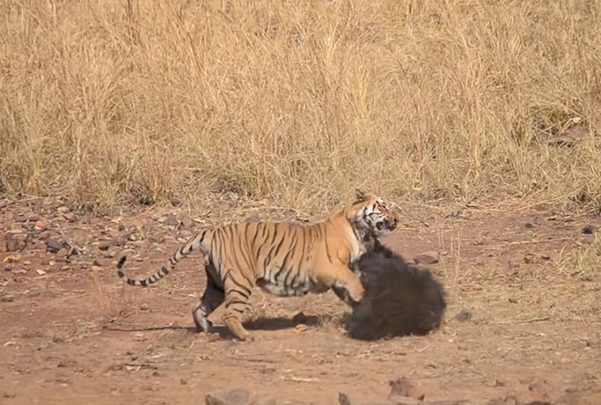 Akshay Kumar guiaba uno de los safaris de la reserva cuando se encontraron con una escena única. Estaban en el territorio de un tigre macho de siete años llamado Matkasur, donde hay una balsa de agua. Una osa y su cachorro se acercaron para beber en el agua. No solo el tigre les echó rápido de su terreno sino que intentó cazar al osezno.