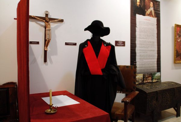 Cervantes también está presente. Se le ha recreado escribiendo en un escritorio de madera que era muy famoso en la época y que era característico de personas con dinero. Una de las joyas que se pueden encontrar en la exposición es la primera edición de El Quijote, la segunda parte. No es el único libro que se puede encontrar, como tampoco el escritorio es el único mueble de la época que está expuesto.
