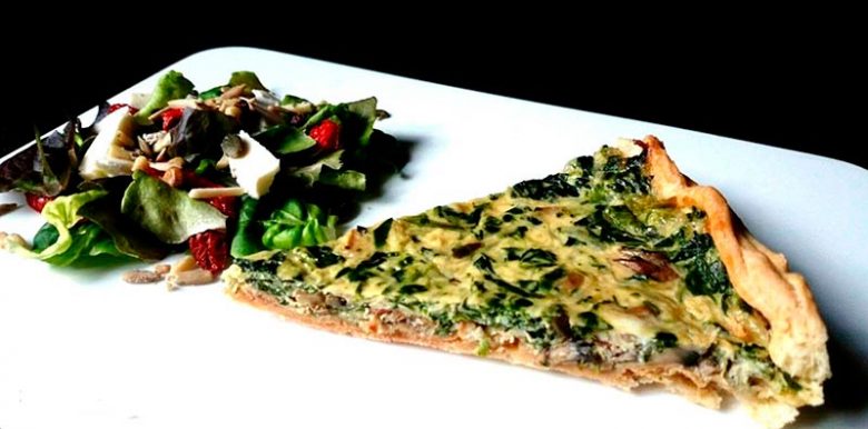 En un recipiente batimos los huevos junto con la nata líquida. Añadimos el salteado de champiñones, beicon y cebolleta y también las espinacas y el queso rallado. Mezclamos bien y salpimentamos.