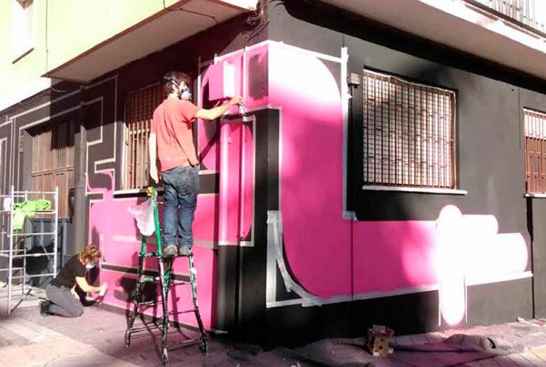En la esquina de la Calle Gütenberg y Ledesma se está en proceso de creación e intervención artística de un nuevo mural de arte urbano, en esta ocasión de la mano de Pistacho Custom Carla y Vicente.