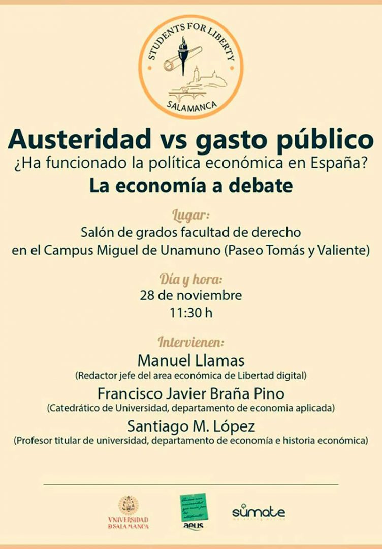 Intervendrán en el mismo Francisco Javier Braña Pino, catedrático de Economía Aplicada de la Universidad de Salamanca, Santiago Manuel López García, profesor titular, departamento de Economía e Historia Económica de la Universidad de Salamanca y Manuel Llamas Fraga, redactor jefe del área Económica de Libertad Digital.