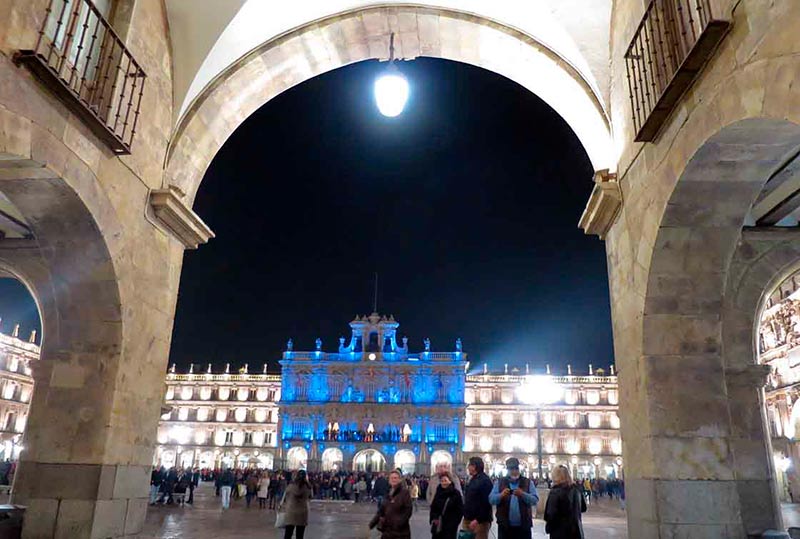 La iluminación de la fachada de azul, color distintivo de la enfermedad, permanecerá desde este viernes hasta el lunes, cuando operarios municipales retirarán los filtros que han sido financiados por la Asociación de Diabéticos de Salamanca sin coste para las arcas municipales.