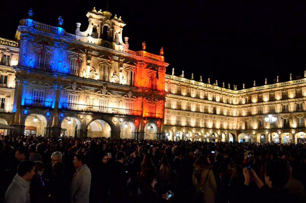 Cinco minutos que se hicieron cortos y al concluir, un aplauso largo, potente y sentido, para que desde Francia puedan escuchar que Salamanca está con ellos. Justo en ese instante, la fachada de la Plaza Mayor se iluminó, como si de una bandera gala se tratara con los colores azul, blanco y rojo franceses.