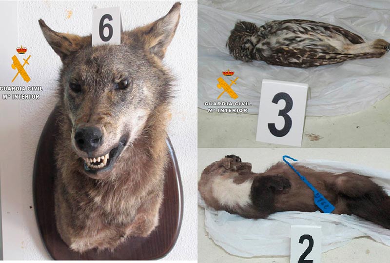 Los agentes de Ledrada y del Seprona inspeccionaron un taller de taxidermia, en cuyo interior hallaron un arcón congelador, varias piezas de caza de especies silvestres protegidas, entre ellas un mochuelo común y una marta común, así como varias cuernas (trofeos) de ejemplares de ciervo y una cabeza de lobo Ibérico, sin ningún tipo de precinto y documentación que acrediten la procedencia de los mismos.