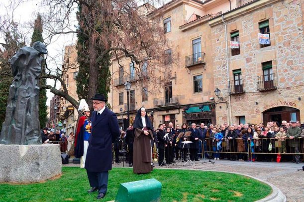 A continuación, se vivió el reconocimiento más institucional. El alcalde invitó a la congregación de los Dominicos y a la Asociación Amigos de Unamuno a que participaran en la ofrenda floral que cada año se realiza a los pies de la escultura situada en Bordadores.
