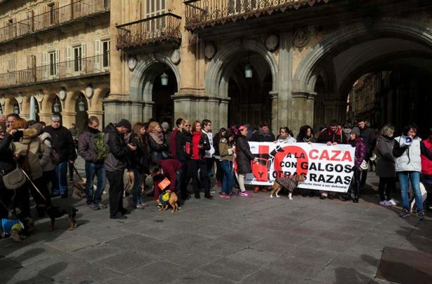 La Plaza Mayor acogió la mañana del domingo una manifestación en defensa de los animales de caza, en especial de los galgos, perros que son muy demandados por los cazadores y una vez concluye el periodo de caza son abandonados.
