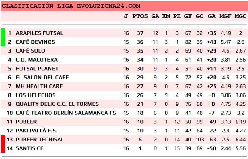 Los cuatro equipos de arriba en la clasificación de la liga Evoluziona24 de Asafusa no ceden y todos ganaron sus partidos en la jornada 16ª.