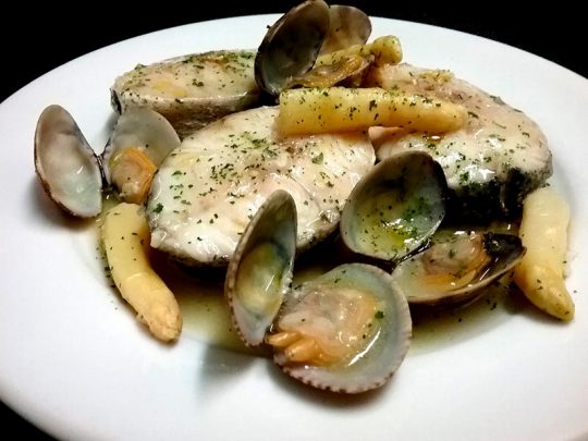 Servimos en platos individuales una rodaja por comensal, le acomodamos las almejas alrededor y le colocamos algunos espárragos por encima.