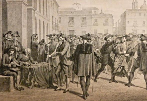 Comenzó el rifirrafe y uno de los embozados desenvainó la espada que llevaba bajo la capa, al tiempo que, silbando, daba la señal para que apareciese una banda armada. Los militares se vieron obligados a huir. Acababa de estallar el Motín de Esquilache en el centro de la capital. Y acaba de estallar escondido tras una capa, precisamente algo que prohibió el señor Leopoldo di Gregorio, marqués de Esquilache, italiano nacido en Mesina y hombre muy fuerte en la corte de Carlos III, empeñado en sacar adelante toda reforma ilustrada que se le pusiese entre ceja y ceja.