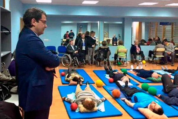 Y acompañaba el texto con una foto del alcalde cruzado de brazos mirando la rehabilitación de un grupo de enfermos de parkinson, tumbados sobre sus colchonetas.