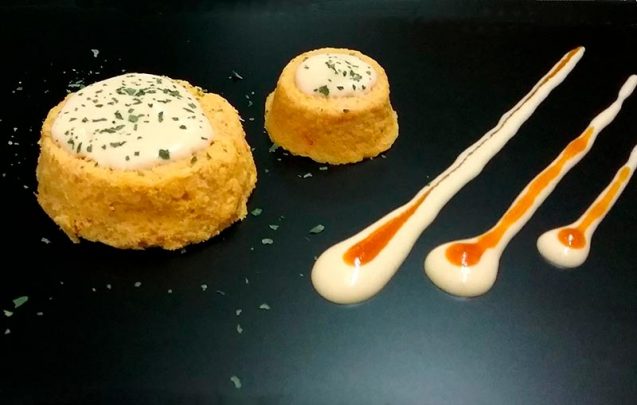 Dispondremos uno o dos pastelitos de cabracho por comensal, acompañado de unas láminas de pan tostado y una mahonesa de pimientos.