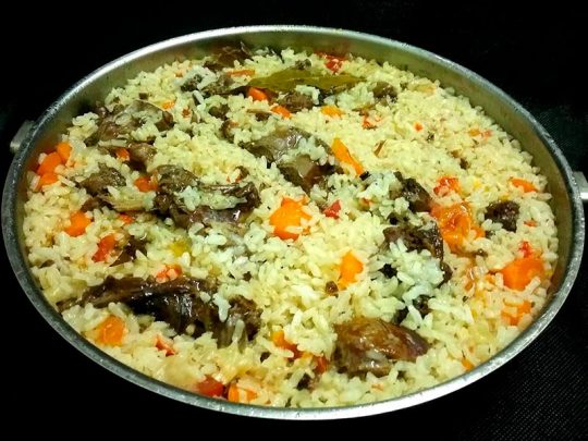 Por otro lado, en una paellera ponemos el resto de la verdura picada y la sofreímos. Añadimos la liebre estofada, junto con los jugos, añadimos el arroz, mezclamos bien, le agregamos el caldo y cocemos unos 20 minutos más.