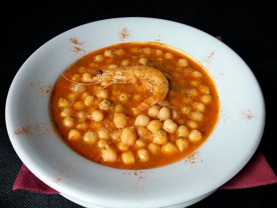 A continuación, ponemos los garbanzos, previamente cocidos o en su defecto de bote escurridos, agregamos la salsa ligera de las verduras y los langostinos, añadimos los langostinos frescos que reservamos en un principio y cocemos a fuego lento durante unos diez minutos, sin que reduzca demasiado porque tiene que quedar un poco caldoso.