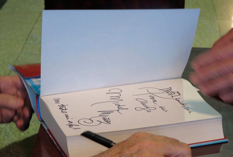El conocido arquitecto y dibujante Peridis presentó este lunes su nueva novela en el Teatro Liceo y posteriormente dedicó libros a sus seguidores, con detalles gráficos personalizados para cada uno.
