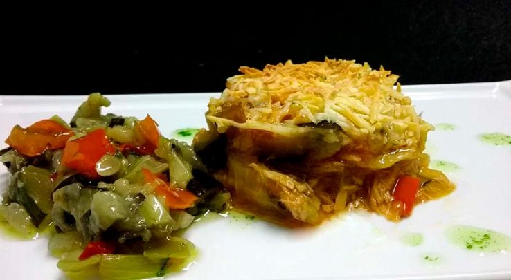 Cortamos el resto de verduras, pimiento rojo y verde, berenjena, calabacín, cebolla y ajo, y lo sofreímos. Reservamos la mitad para la decoración y el resto, le añadimos el atún escurrido y tomate frito y cocinamos la mezcla en conjunto unos minutos.