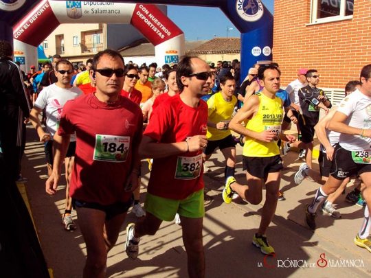 En la soleada mañana de hoy, con temperatura más que primaveral, puntualmente, a las 11:00 horas, en la Plaza de los Reyes Católicos de la localidad, sobre una inscripción inicial de 402 corredores, tomaron la salida los 382 atletas que finalmente recogieron su dorsal para recorrer los 10.530 m del circuito por caminos y senderos, “cuestecita” incluida, preparado con esmero por el Ayuntamiento de Aldeatejada y la Diputación Provincial de Salamanca, en colaboración con CGB Obra Social.