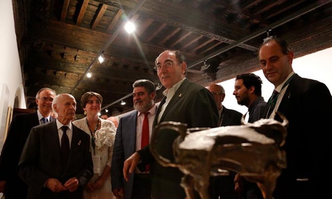 El escultor Venancio Blanco; el presidente de Iberdrola, Ignacio Galán; el alcalde de Ciudad Rodrigo, Juan Tomás Muñoz; el presidente de la Fundación Duques de Soria, Rafael Benjumea; y el patriarca del Bolsín, Miguel Cid, han inaugurado esta tarde la muestra, que bajo el título Venancio Blanco y Antonio Carnicero: Toros y caballos de dos artistas salmantinos, permitirá contemplar la representación artística de la tauromaquia.