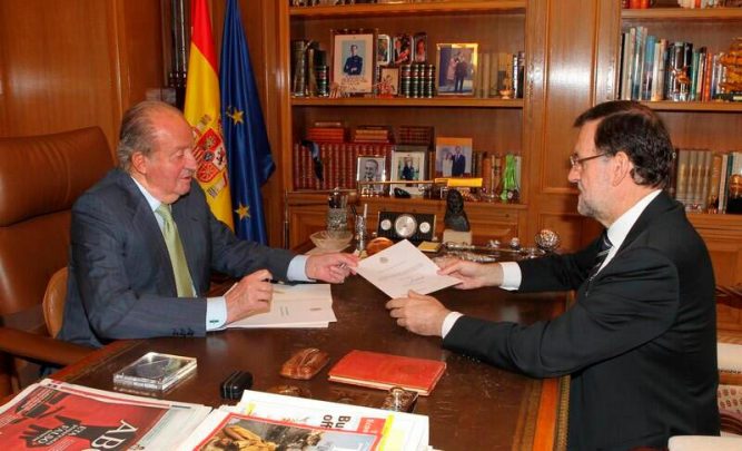 El mensaje en Twitter va acompañado por una imagen del documento y dos fotografías de Rajoy con el monarca en el despacho de este último en el Palacio de La Zarzuela. En una de ellas, se ve al Rey entregando el documento al presidente del Gobierno, y en la otra aparecen de pie, sonrientes, estrechándose la mano.