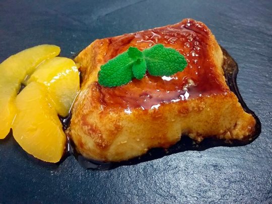 Os proponemos que decoréis el flan con una hojitas de menta o con rodajas de melocotón, pero dejamos abierta la decoración al gusto de los comensales.