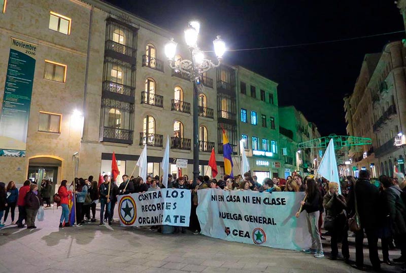 La mitad de los alumnos de enseñanzas medias de Salamanca secundaron la huelga convocada este jueves en protesta por la Lomce, las reválidas y la reforma universitaria que pretende implantar el sistema de 3 años de grado y 2 de máster, conocido como el 3+2.