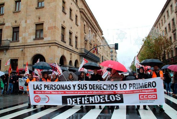“Estamos aquí para que sepa el Gobierno que no nos fiamos de su diálogo, que no sirve para nada porque no se llega a acuerdos”, ha manifestado José Luis Hernández, secretario general de UGT Salamanca, “no se puede intentar abrir dialogo social y negociar con el PSOE el sueldo mínimo interprofesional a espaldas de los agentes sociales”. Hernández también ha reivindicado que el fondo de las pensiones se utilice para otras materias y que se mejore la situación de los parados de larga duración.