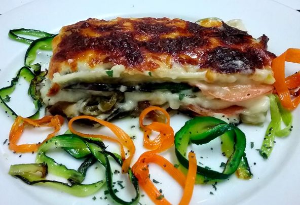 Desmoldamos la lasaña y colocamos los cuadros de lasaña que decoraremos con tallarines de calabacín y cebolla salteados.