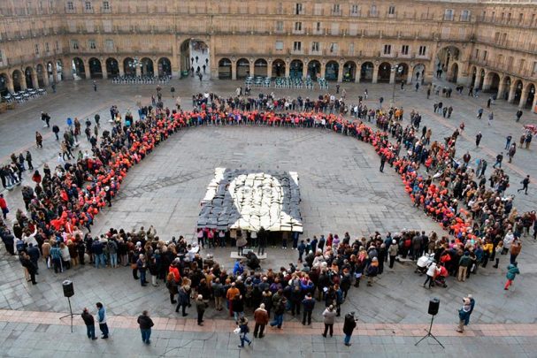 La mañana de este jueves han comenzado los actos para celebrar el centenario y lo han hecho con un mosaico en la que se podía ver la cara de la fundadora de las Siervas de San José, Santa Bonifacia, la única santa salmantina, protegido con un gigantesco marco formado por más de 600 niños. Los alumnos que actualmente están matriculados en el colegio.