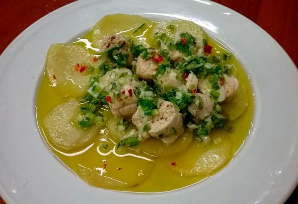 Para hacer la vinagreta, con la que adornamos el plato, necesitamos cortar en cuadratitos el pimiento verde, cebolleta o cebolla morada, ajo y la guindilla de cayena. Los mezclamos todo con tres partes de aceite y una de vinagre. Removemos y reservamos.