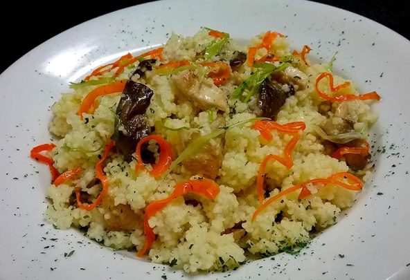 Una vez transcurridos los tres minutos de reposo del cuscús, añadimos una nuez de mantequilla y lo colocamos de nuevo en el fuego. Agregamos las verduras, las setas y el pollo salteado, removemos en conjunto y servimos.