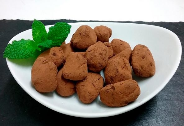 Las bolas que luego serán trufas, las elaboramos con la ayuda de una cuchara de café para hacerlas pequeñitas. Las redondeamos y las untamos con el cacao amargo en polvo.