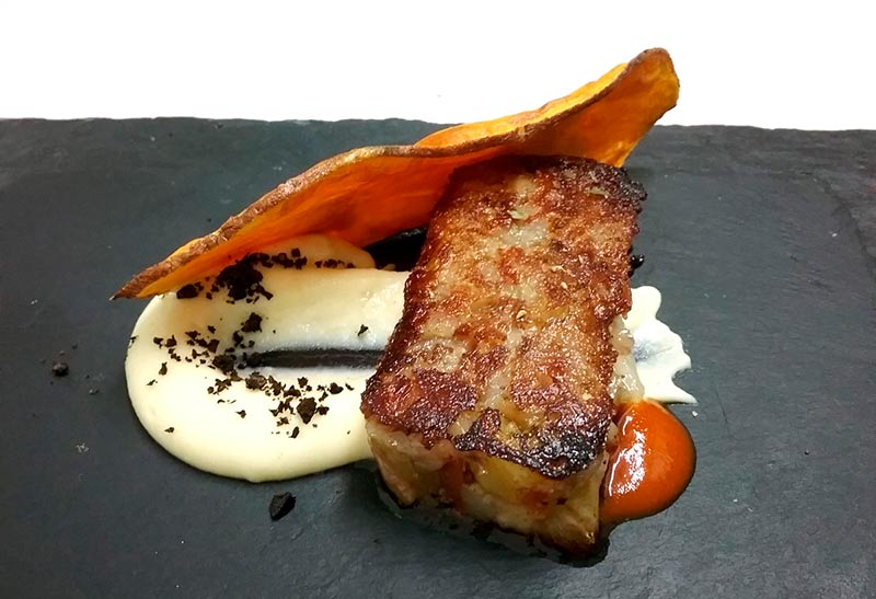 Sobre una cama de puré de patata frita colocamos el lingote de manitas de cerdo.
