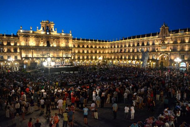 Andrés Salado, el director que dirigió a la Orquesta Sinfónica de Castilla y León en su concierto en la Plaza Mayor, señaló que maridan muy bien la música clásica con las plazas. «La acústica es muy distinta a la de un teatro, pero es un regalo ver a personas sentadas disfrutando de la música a otros sentados en las terrazas tomando una cerveza y a niños jugando al balón«.
