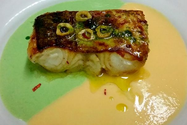 Verteremos a la vez las dos salsas, colocaremos encima los lomos de merluza con la piel hacia arriba y la decoraremos con unos chips de ajo y un chorrito de aceite de oliva.