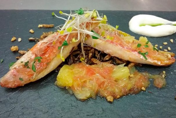 Disponemos en el centro del plato un puñado de arroz negro salvaje frito, acomodamos los filetes de salmonete y vertemos un poco de salsa de cítrico y unos brotes frescos a modo de decoración y guarnición.