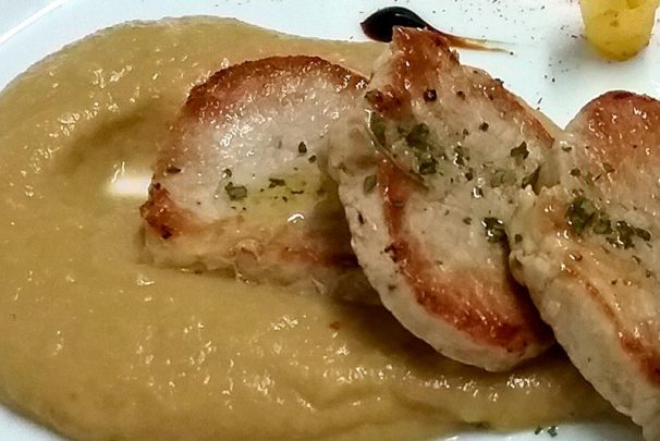 Disponemos en el centro del plato una cucharada colmada de castañas y colocamos los medallones ibéricos de cerdo y decoramos con los ‘pétalos’ de manzana.