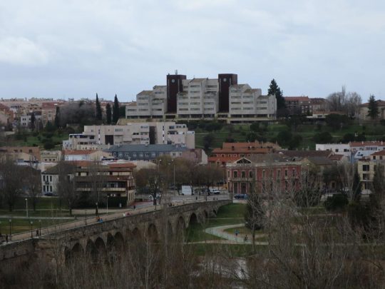Lo que sí puedo asegurar es que el lugar elegido fue el idóneo, que las vistas de Salamanca desde el Teso de la Feria son espectaculares y que la presencia del Parador sirvió para rehabilitar el Arrabal del Puente. Hoy, acostumbrado a él ya no me parece tan feo, aunque cuando viene alguien de fuera y divisa la margen izquierda desde la Peña Celestina siempre me preguntan por ese edificio que desentona en aquel alto. Los alrededores se ajardinaron y se construyeron dos colegios junto al parador, el Virgen de la Vega y las unidades para niños sordos.