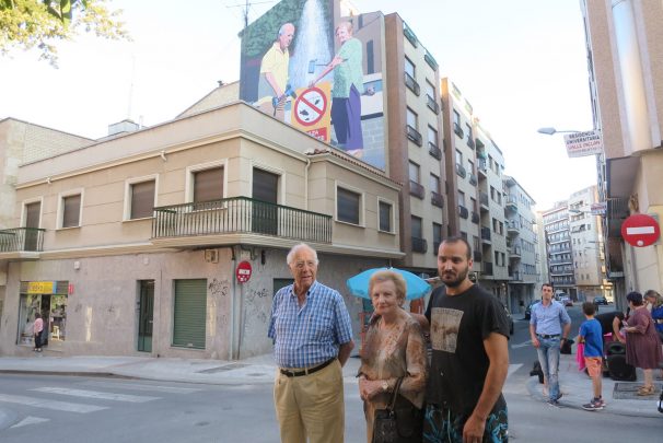 [dropcap]X[/dropcap]XL, sí, XXL porque la obra mide más de 100 metros cuadrados y en ella se pueden ver a dos personas, Carmen y Loren, matrimonio del barrio del Oeste que dieron las primeras ‘pinceladas’ para que el barrio sea lo que es hoy. Lorenzo Amigo fue el primer presidente de Zoes, el que impulsó el rastro en la plaza del Oeste y el que sembró, junto con otros vecinos, para que el cemento se convirtiera en un barrio alegre que hace sonreír.