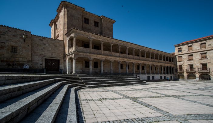 Esta preciosa plaza está presidida por el claustro de los Francos, trasladado desde la actual Gran Vía al patio de las Siervas de San José. Las Siervas permitieron a Pablo Beltrán de Heredia dar la vuelta a la fachada del edifico para que los salmantinos pudieran disfrutarla. Con la intervención en el palacio y en la plaza se embelleció el entorno que hoy solo afea el solar del que fuera teatro Bretón.