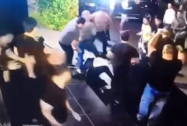 Una cámara de seguridad grabó cómo no le permiten pasar a él junto a unos amigos y cómo comienza la trifulca.