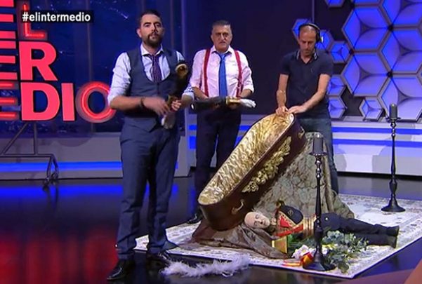 El Gran Wyoming destaca que, «hasta que se decida el destino final de Franco», El Intermedio tiene la solución: «Hemos decidido albergar temporalmente el cadáver embalsamado de Francisco Franco. Creo que se sentirá muy a gusto, se encuentra en un polígono alrededor de algo que siempre le ha gustado mucho, ¡cunetas!».