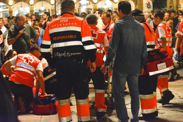 Primero, acudieron a socorrerarla efectivos de Protección Civil y posteriormente, se personaron en la Plaza Mayor miembros de Cruz Roja.