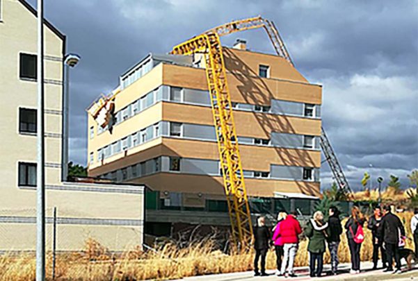 El desplome se produjo cuando la estructura de soporte se venció y la parte horizontal de la grúa acabó estrellandose sobre la azotea de este edifico situado frente al centro comercial Camaretas.