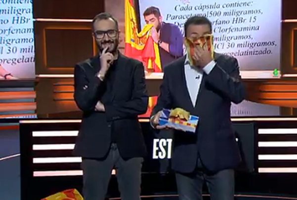 Después de sonarse los mocos, envió un mensaje a la audiencia: «¿lo veis? No pasa nada». Posteriormente, Jair Dominguez invitó al presentador a lanzar el pañuelo en una urna del 1-O, pero eso le pareció demasiado. «Uf, no sé, no sé», dijo.