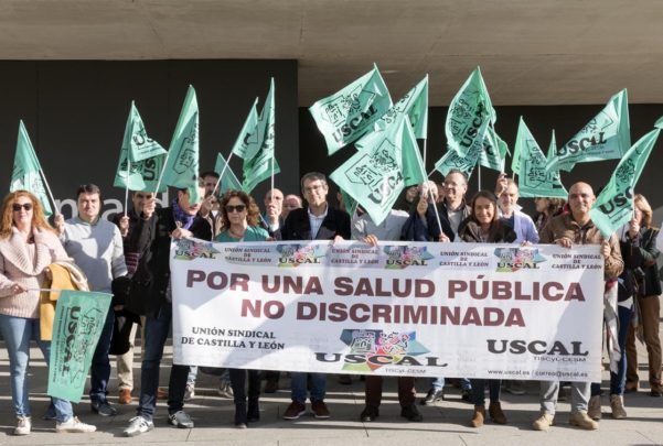 La Unión Sindical de Castilla y León (USCAL) convocó este jueves una huelga de sanitarios no asistenciales que pertenecen a la Junta. A las puertas de la delegación territorial de Salamanca, unos 50 miembros de este sector se dieron cita para protestar por su situación y aportar datos sobre el seguimiento del parón.