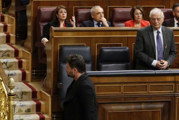 Rufián ha calificado al ministro de Asuntos Exteriores, Josep Borrell, como «el ministro más indigno de la historia de la democracia española», a lo que Borrell ha respondido que «una vez más ha vertido usted sobre el hemiciclo una mezcla de serrín y estiércol, que es lo único que es capaz de producir».