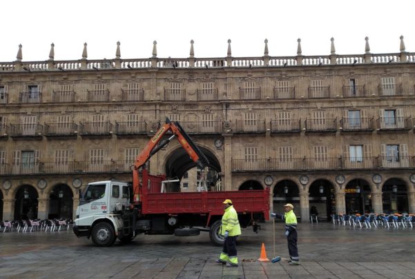 Los operarios municipales retiraron este miércoles de nuevo los bancos de la Plaza Mayor, sin apenas darle tiempo a secarse al cemento tras colocarlos de nuevo hace algo más de dos semanas, para recibir a los jóvenes que vienen al Fin de Año Universitario, antes conocido como la Nochevieja Universitaria.