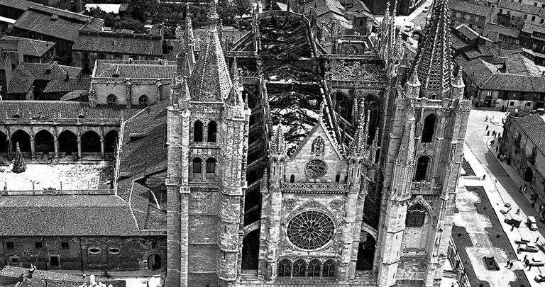S.Gallo/ ICAL. El incendio registrado en la cubierta de la catedral de Notre Dame de París ha hecho recordar el fuego que amenazó la catedral de León hace más de 50 años. Fue el 29 de mayo de 1966 cuando un rayo puso en jaque al primer templo de la capital leonesa, inmersa en esa tarde de domingo en la festividad de Pentecostés y en la retransmisión de la final de la Copa del Generalísimo -actual Copa del Rey- entre el Zaragoza y el Atlético de Bilbao.