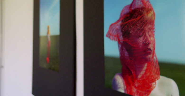 El verde de la pradera y el azul del cielo son el fondo para que la silueta y los pantalones rojos sobresalgan y hagan que el visitante se fije en la modelo cuyo único ‘complemento’ es un elemento de plástico, sea en forma de redecilla, bolsa o cortina.