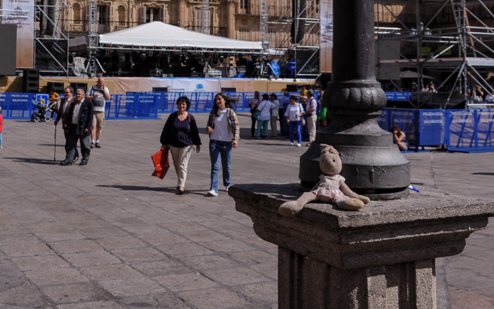 Quizá el dueño o la dueña del osito lo está buscando, pues hasta mediodía estaba esperando a ser rescatado en una de las farolas de la Plaza Mayor.