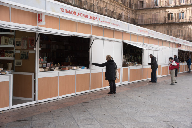 [dropcap]V[/dropcap]eintitrés librerías llevan desde el 19 de octubre asentadas en la Plaza Mayor, ofreciendo libros antiguos y de ocasión a los transeúntes que hacen suya el ágora salmantina, sean de aquí o de allí, como los propios libreros, que muchos se han acercado hasta la ciudad del Tormes desde Valencia, Huesca, Madrid, Ponferrada o Zaragoza.